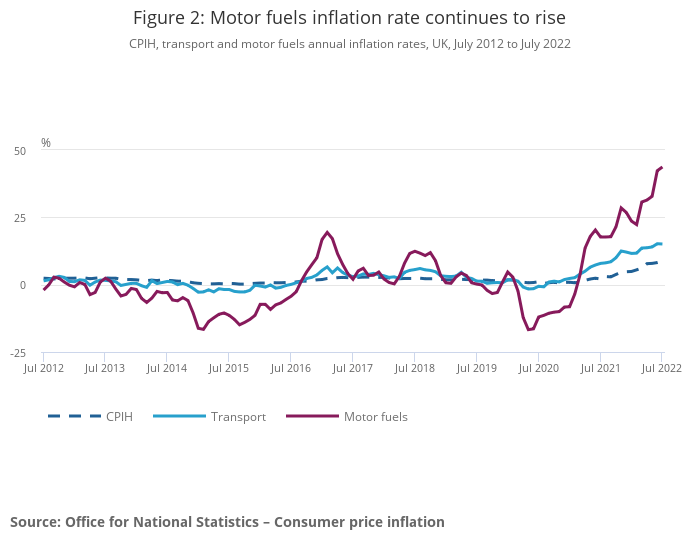 CPIH, transport and motor fuels annual inflation rates, UK, July 2012 to July 2022