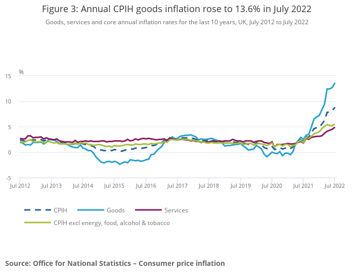 Figure 3: Annual CPIH goods inflation rose to 13.6% in July 2022