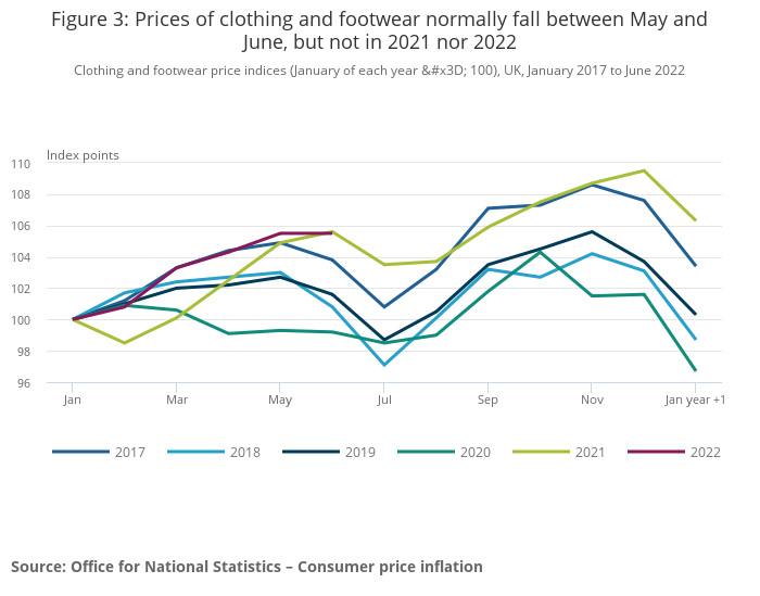 Figure 3: Prices of clothing and footwear normally fall between May and June, but not in 2021 nor 2022