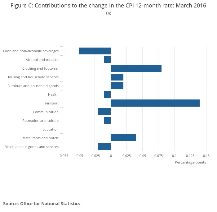 This section explains which goods and services had the biggest impact on the change to the 12-month rate between February and March 2016 and, where relevant, considers the longer-term inflationary trends for these goods and services.