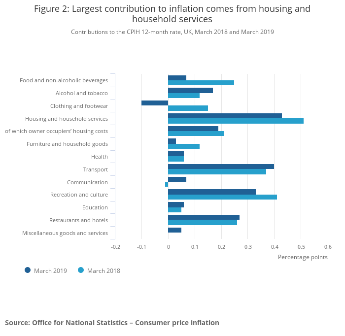 The Consumer Prices Index including owner occupiers’ housing costs (CPIH) 12-month inflation rate was 1.8% in March 2019, unchanged from February 2019.