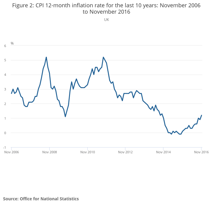 The CPI 12-month rate (the amount prices change over a year) between November 2015 and November 2016 stood at 1.2%. This means that a basket of goods and services that cost £100.00 in November 2015 would have cost £101.20 in November 2016.