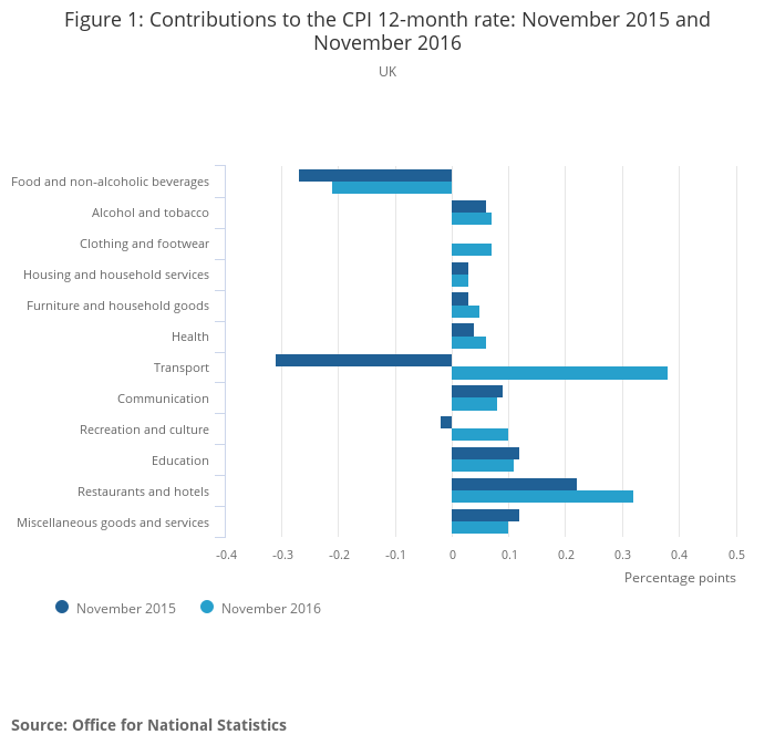 Figure 1 shows the contributions to the CPI 12-month rate in November 2016 compared with the contributions to the 12-month rate a year earlier.