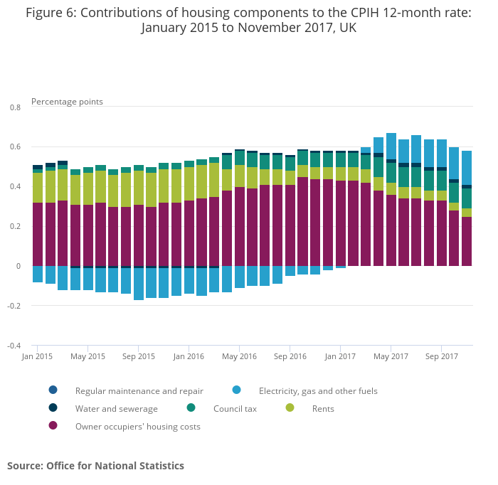In comparison, the Consumer Prices Index (CPI) 12-month rate has risen slightly to 3.1% in November 2017 from 3.0% in October. The CPI rate is higher than the CPIH equivalent principally because the CPI excludes owner occupiers’ housing costs. These rose by 1.5% in the year to November 2017, less than the CPI rate of 3.1% and, as a result, they pulled the CPI rate down slightly, to CPIH.