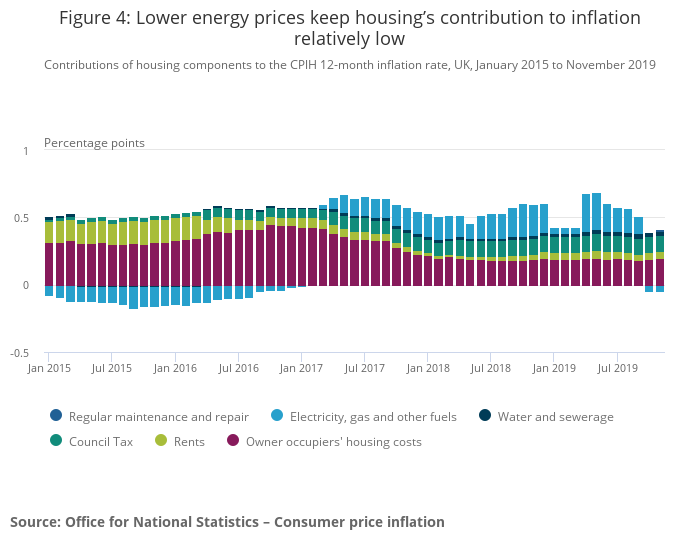The largest contribution to the CPIH 12-month inflation rate in November 2019 came from housing, water, electricity, gas and other fuels (+0.36 percentage points).
