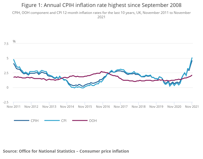 The Consumer Prices Index including owner occupiers’ housing costs (CPIH) rose by 4.6% in the 12 months to November 2021, up from 3.8% in the 12 months to October.