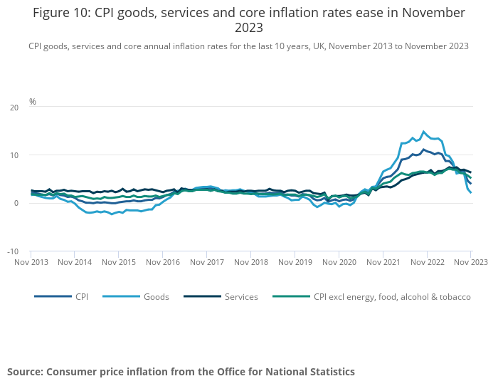 CPI goods, services and core annual inflation rates for the last 10 years, UK, November 2013 to November 2023