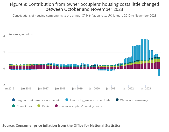 OOH’s contribution of 0.85 percentage points was little changed between October and November 2023, and these were the joint highest since at least January 2006. The contribution from housing and household services overall was 0.58 percentage points, also little changed from October 2023.
