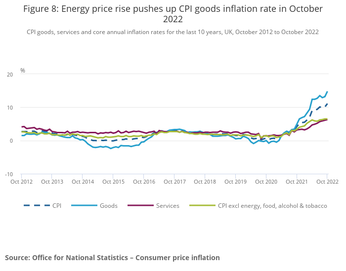Download this chart Figure 8: Energy price rise pushes up CPI goods inflation rate in October 2022