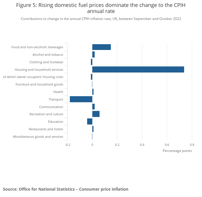 The largest upward contributions to the annual CPIH inflation rate in October 2022 came from housing and household services (principally from electricity, gas, and other fuels), food and non-alcoholic beverages, and transport (principally motor fuels).