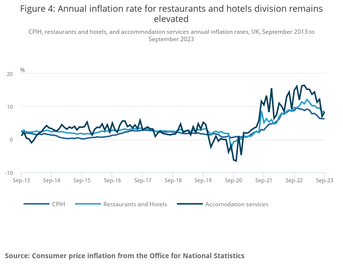 The annual inflation rate for restaurants and hotels was 8.6% in September 2023, up from 8.3% in August. On a monthly basis, prices rose by 0.9% between August and September 2023, compared with a rise of 0.6% between the same two months a year ago.