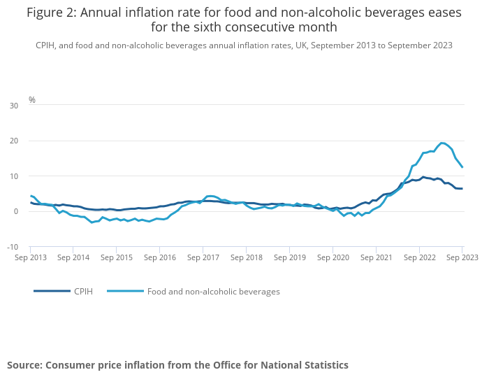 CPIH, and food and non-alcoholic beverages annual inflation rates, UK, September 2013 to September 2023