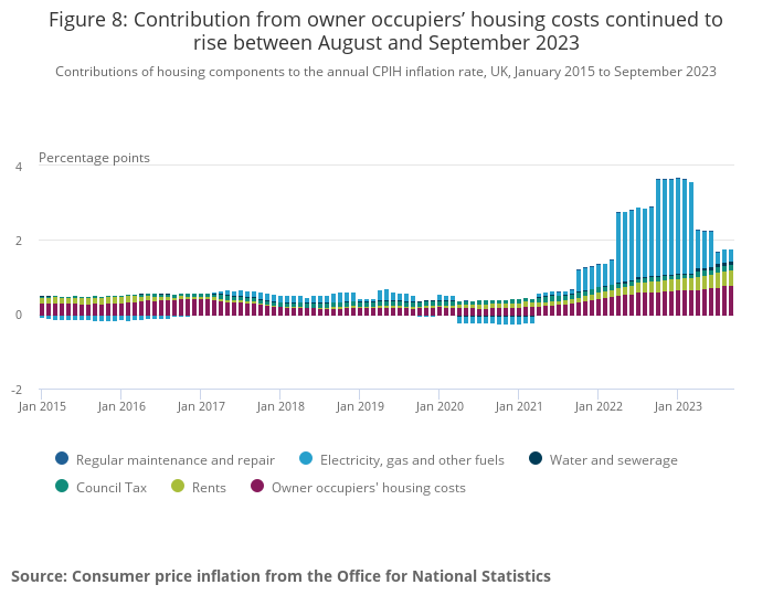 OOH’s contribution rose from 0.78 to 0.80 percentage points between August and September 2023, meaning the contribution is now higher than at any time since at least January 2006. The contribution from rents rose from 0.41 to 0.42 percentage points between August and September 2023, which is also higher than at any time since at least January 2006.