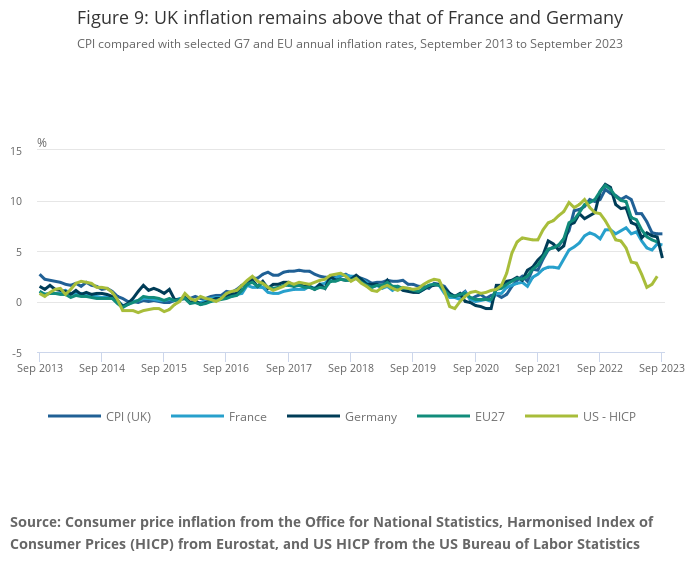 CPI compared with selected G7 and EU annual inflation rates, September 2013 to September 2023