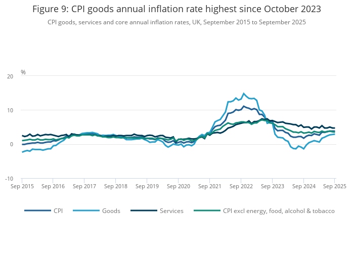 The CPI all-goods index rose by 2.9% in the 12 months to September 2025, up from 2.8% in the 12 months to August. This is the highest rate since October 2023, when it was 2.9%.