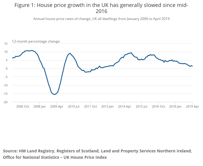 Average house prices in the UK increased by 1.4% in the year to April 2019, down from 1.6% in March 2019 (Figure 1). Over the past three years, there has been a general slowdown in UK house price growth, driven mainly by a slowdown in the south and east of England.