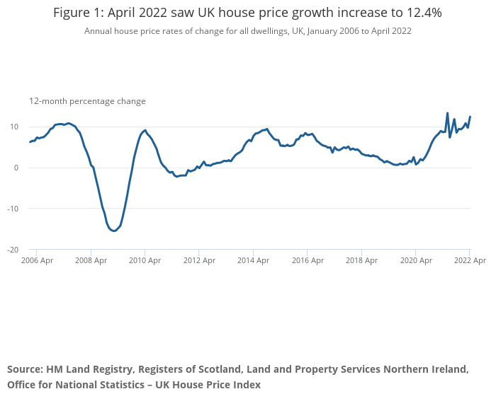 The latest house price data published on GOV.UK by HM Land Registry (HMLR) for April 2022 show that average house prices in the UK increased by 12.4% in the year to April 2022, up from 9.7% in the year to March 2022.