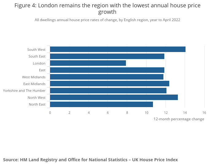 The lowest annual house price growth was in London, where average prices increased by 7.9% over the year to April 2022, up from 4.9% in March 2022.