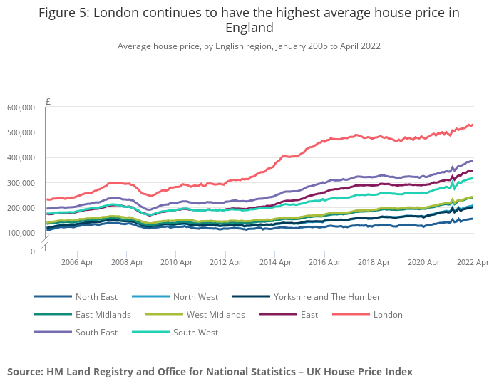 Despite being the region with the lowest annual growth, London's average house prices remain the most expensive of any region in the UK, with an average price of £530,000 in April 2022.