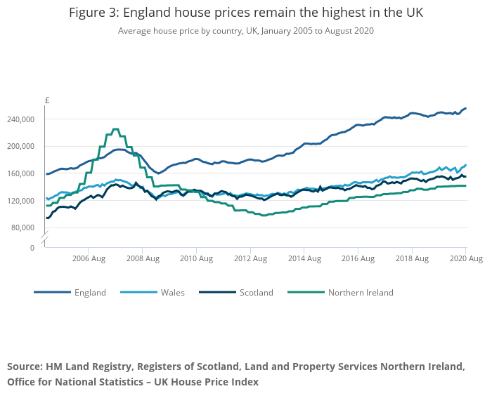 On a non-seasonally adjusted basis, average house prices in the UK increased by 0.7% between July 2020 and August 2020, compared with an increase of 0.3% in the same period a year ago.