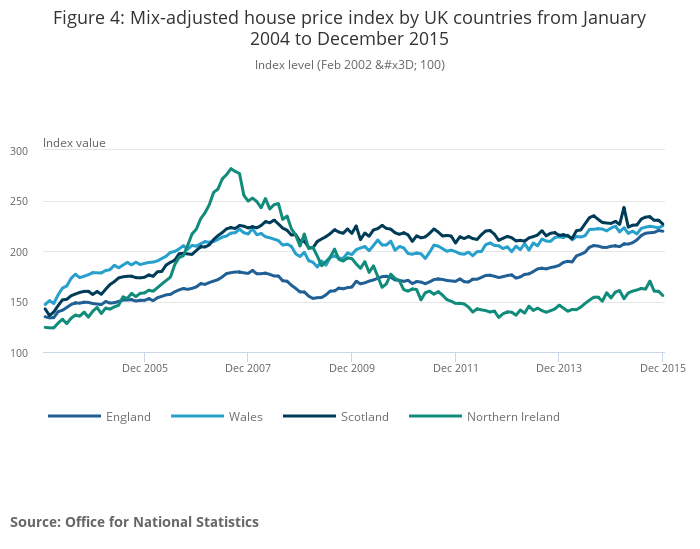 Average mix-adjusted house prices in December 2015 stood at £301,000 in England, £175,000 in Wales, £193,000 in Scotland and £148,000 in Northern Ireland (Figure 7).