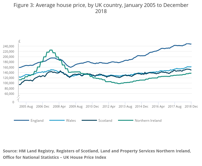 Figure 3: Average house price, by UK country, January 2005 to December 2018