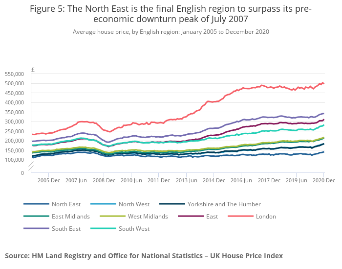 The North East continued to have the lowest average house price, at £141,000, and is the final English region to surpass its pre-economic downturn peak of July 2007 (Figure 5).