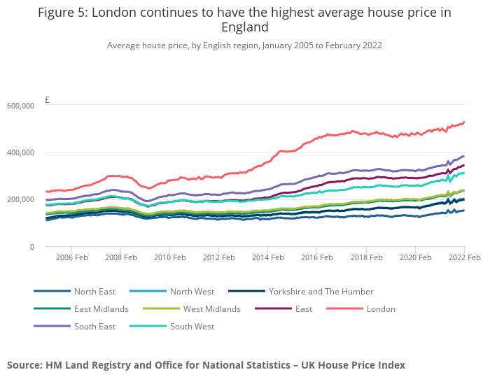 Despite being the region with the lowest annual growth, London’s average house prices remain the most expensive of any region in the UK, with an average price of £530,000 in February 2022.