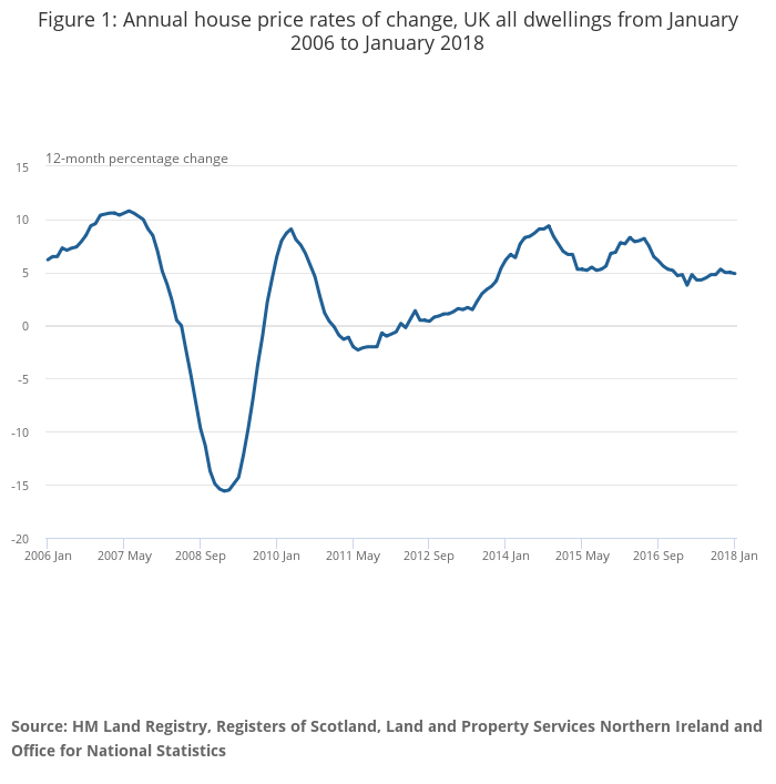 Average house prices in the UK have increased by 4.9% in the year to January 2018 (down from 5.0% in December 2017). The annual growth rate has slowed since mid-2016 but has remained broadly around 5% since 2017.