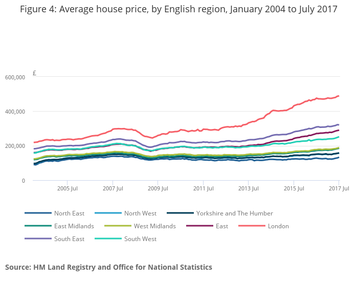 Figure 4: Average house price, by English region, January 2004 to July 2017