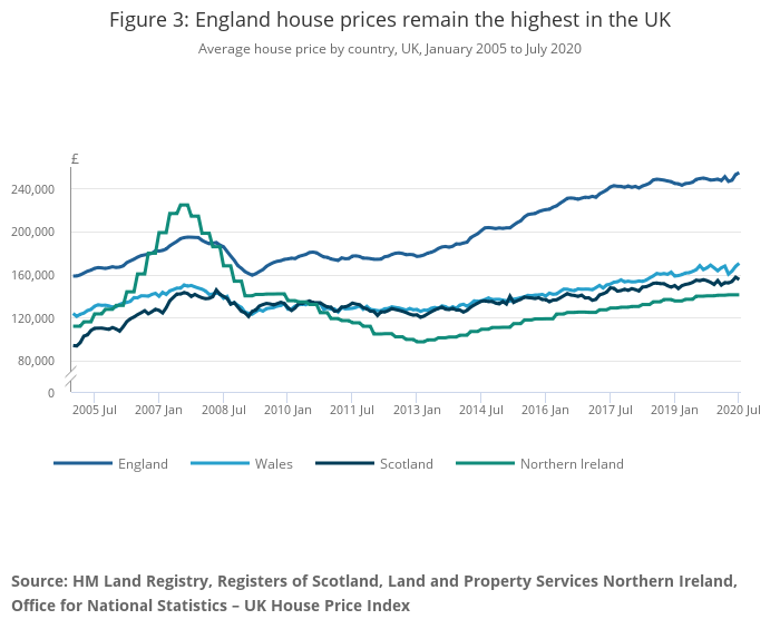 House price growth in Wales increased by 3.6% over the year to July 2020, up from 2.9% in June 2020, with the average house price in Wales at £170,000.