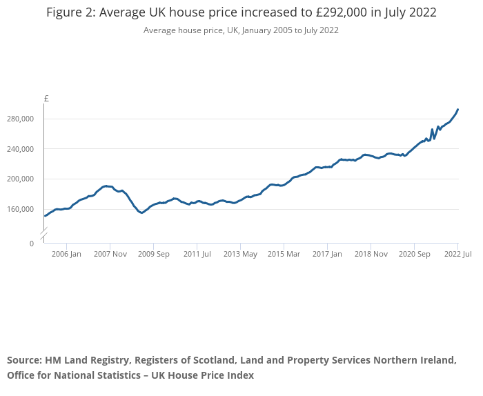The average UK house price was £292,000 in July 2022, which is £39,000 higher than this time last year.