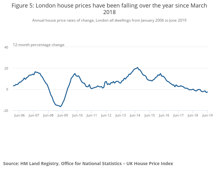 The lowest annual growth was in London, where prices fell by 2.7% over the year to June 2019, less than the 3.1% fall in May 2019. Average house prices in London have now been falling over the year each month since March 2018.