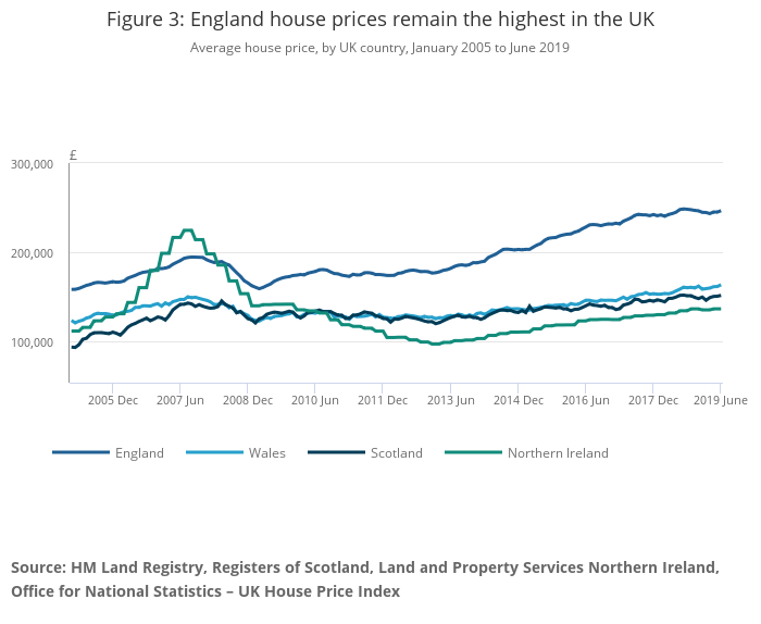 House price growth in Wales increased by 4.4% in the year to June 2019, down from 4.6% in May 2019, with the average house price at £164,000. House prices in Scotland increased by 1.3% in the year to June 2019, down from 1.5% in the year to May 2019, with the average house price in Scotland now £152,000. The average house price in England increased by 0.7% over the year to June 2019, remaining the same from May 2019 (0.7%) with the average house price in England now £247,000. Northern Ireland house prices increased by 3.5% over the year to Quarter 2 (April to June) 2019. Northern Ireland remains the cheapest UK country to purchase a property in, with the average house price at £137,000 (Figure 3).