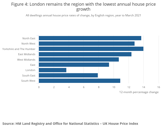The lowest annual growth was in London, where average prices increased by 3.7% over the year to March 2021, down from 4.4% in February 2021.