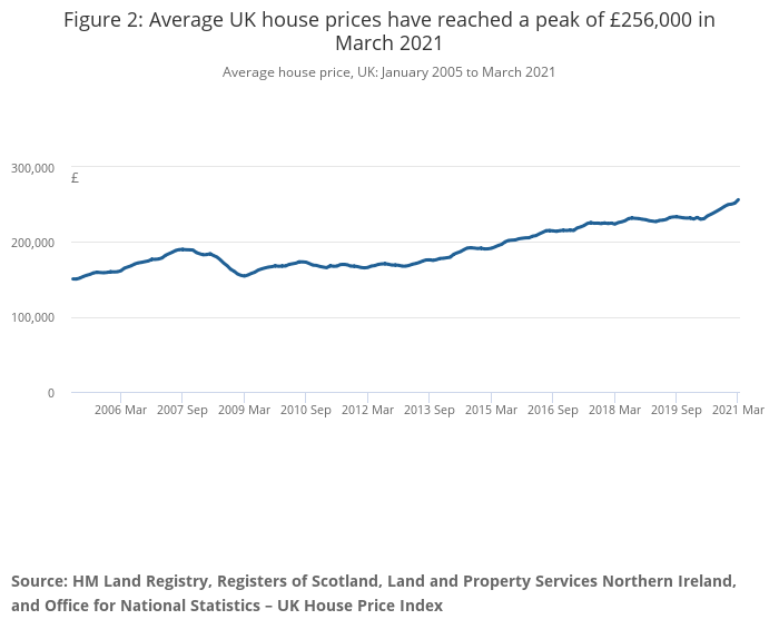 Figure 2: Average UK house prices have reached a peak of £256,000 in March 2021