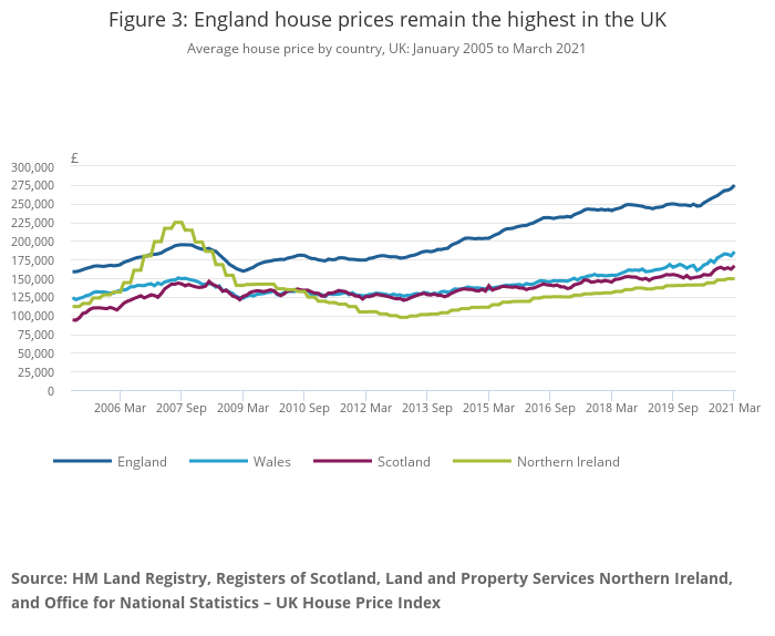 Average house prices increased over the year in England to £275,000 (10.2%), in Wales to £185,000 (11.0%), in Scotland to £167,000 (10.6%) and in Northern Ireland to £149,000 (6.0%).