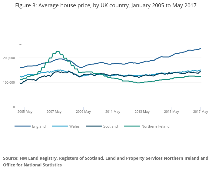 The main contribution to the increase in UK house prices came from England, where house prices increased by 5.0% over the year to May 2017, with the average price in England now £238,000. Wales saw house prices increase by 3.8% over the last 12 months to stand at £150,000. In Scotland, the average price increased by 3.5% over the year to stand at £143,000. The average price in Northern Ireland currently stands at £124,000, an increase of 4.3% over the year to Quarter 1 (Jan to Mar) 2017.