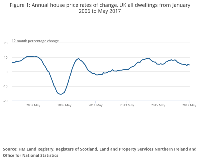 Average house prices in the UK have increased by 4.7% in the year to May 2017 (down from 5.3% in the year to April 2017). The annual growth rate has slowed since mid-2016 but has remained broadly around 5% during 2017.
