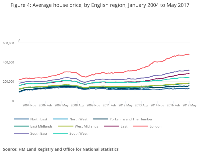 Figure 4: Average house price, by English region, January 2004 to May 2017
