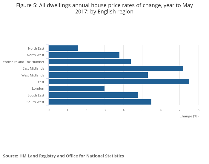 Figure 5: All dwellings annual house price rates of change, year to May 2017: by English region