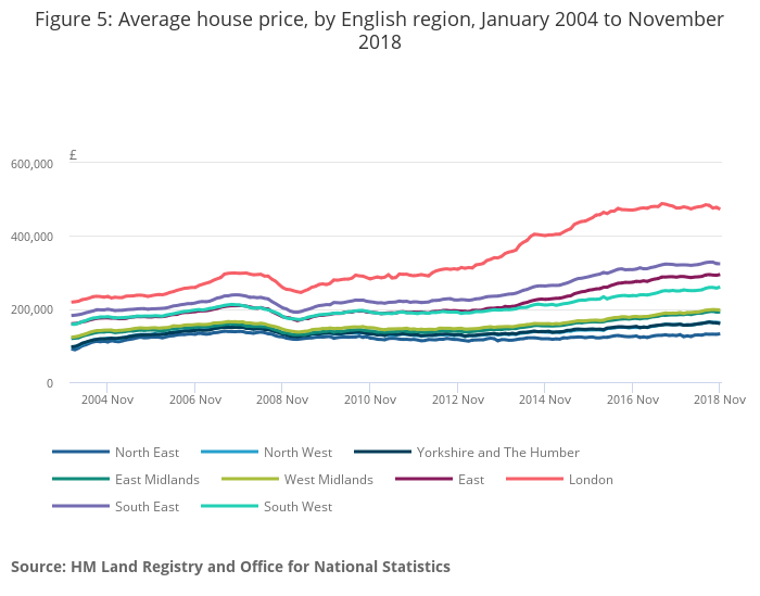 Figure 5: Average house price, by English region, January 2004 to November 2018