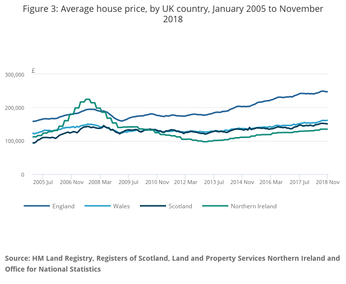 Figure 3: Average house price, by UK country, January 2005 to November 2018