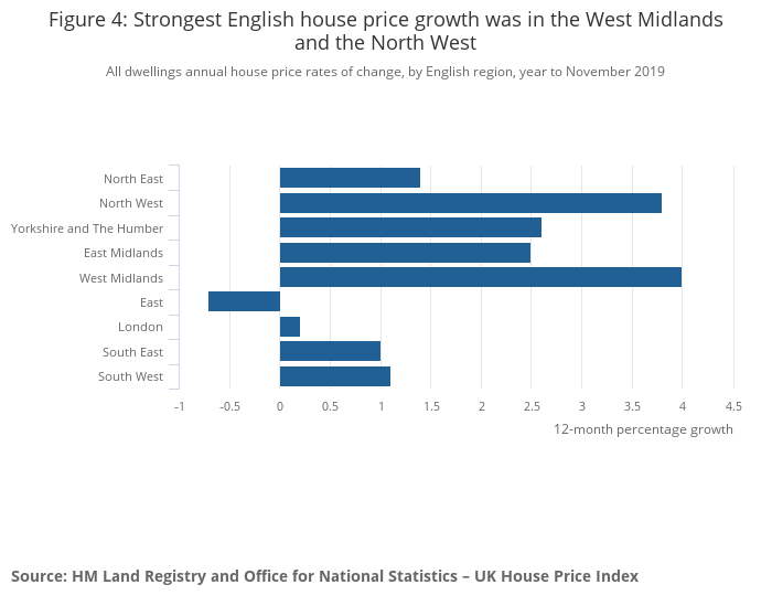 Image .csv .xlsAt a regional level, the West Midlands was the English region with the highest annual house price growth, with prices increasing by 4.0% in the year to November 2019 (Figure 4). This was followed by the North West, increasing by 3.8%.