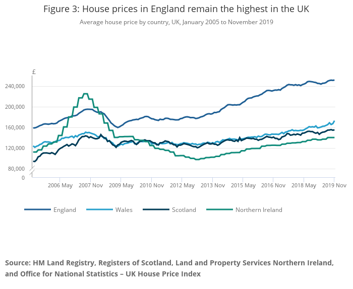 Average house prices increased over the year in England to £251,000 (1.7%), Wales to £173,000 (7.8%), Scotland to £155,000 (3.5%) and Northern Ireland to £140,000 (4.0%).