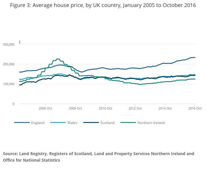 Figure 3: Average house price, by UK country, January 2005 to October 2016