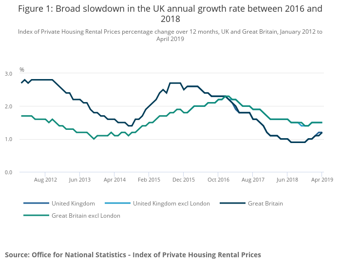 Rental prices for the UK excluding London increased by 1.5% in the 12 months to April 2019, unchanged from March 2019 (Figure 1). London private rental prices increased by 0.5% in the 12 months to April 2019, unchanged from 0.5% in March 2019.