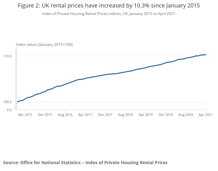 Focusing on the long-term trend, between January 2015 and April 2021, private rental prices in the UK increased by 10.3% (Figure 2).