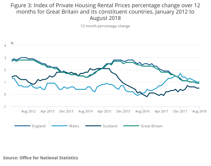 In England, private rental prices grew by 0.9%, Wales saw growth of 1.0% while Scotland saw rental prices increase by 0.5% in the 12 months to August 2018.
