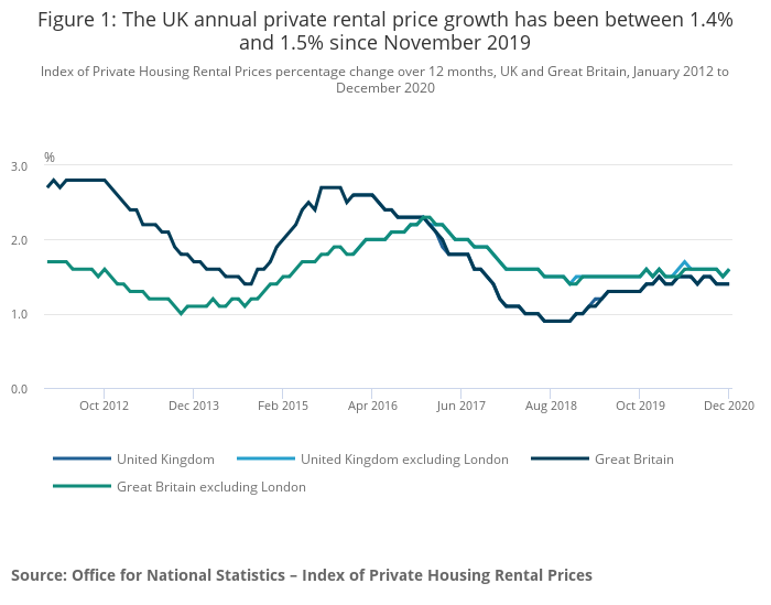 In the 12 months to December 2020, rental prices for the UK excluding London increased by 1.6%, up from 1.5% in the 12 months to November 2020 (Figure 1). London private rental prices increased by 0.9% in the 12 months to December 2020, down from 1.1% in the 12 months to November 2020.